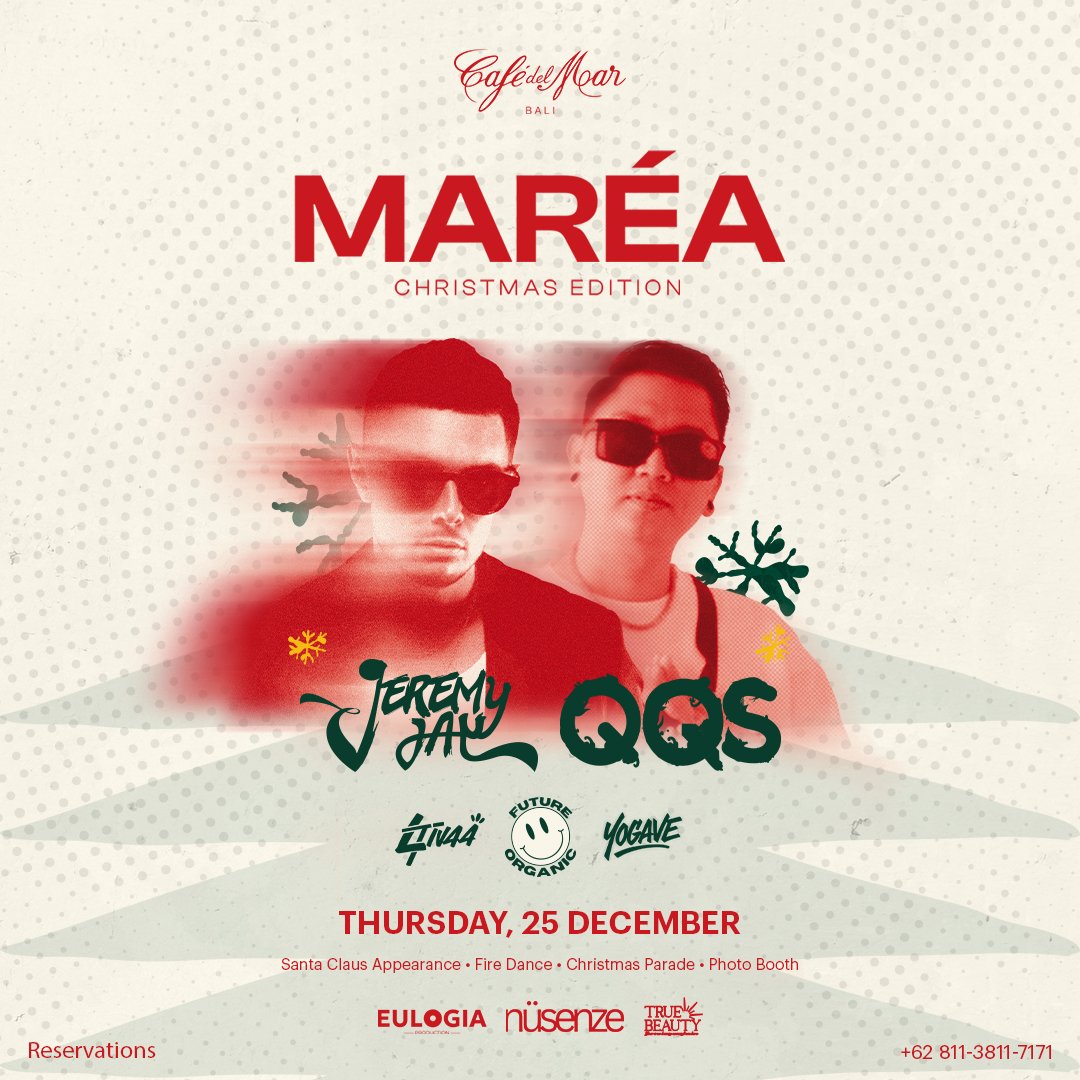 The full lineup for our Christmas Party at Café del Mar Bali 🔥🎄 Secure your tickets, reserve your VIP Tables and suites, and get ready to celebrate the season with hypnotic Afro grooves and island beats.